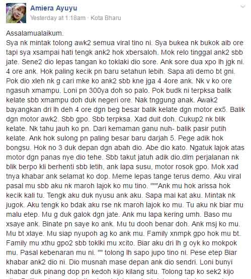 Disebabkan keadaan yang begitu mendesak, si suami terpaksa membawa keempat-empat anaknya itu pulang ke kampung di Pasir Putih, Kelantan, dengan menaiki motosikal.