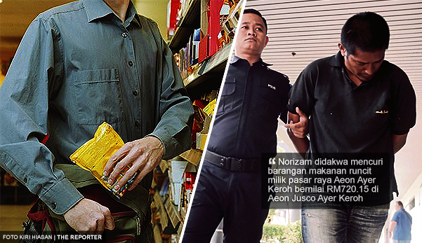 Mengikut pertuduhan, Norizam didakwa mencuri barangan makanan runcit milik pasar raya Aeon Ayer Keroh bernilai RM720.15 di Aeon Jusco Ayer Keroh pada jam 9.30 malam, 7 Oktober lalu.
