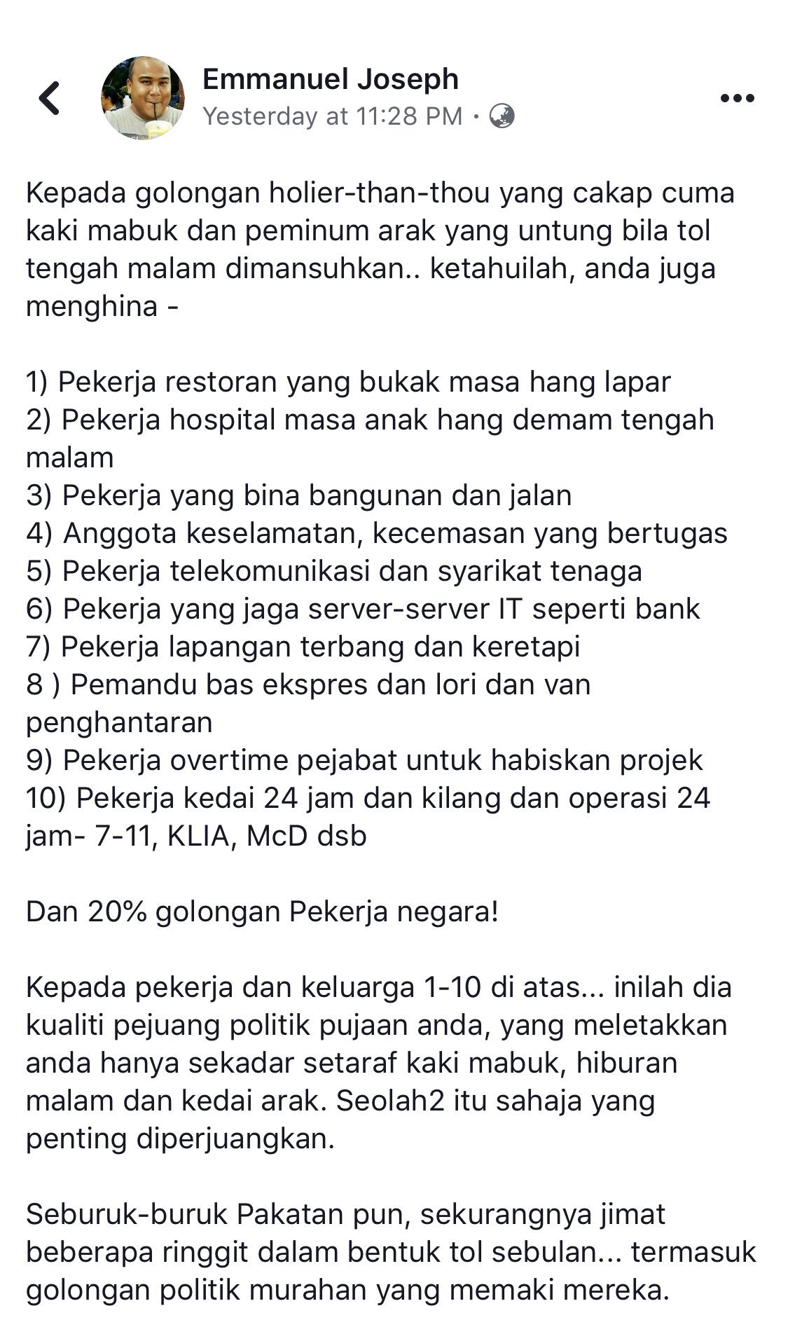 "Tol dicadangkan untuk dihapuskan hanya dari jam 11 malam hingga 5 pagi. Ini bermakna, kalau tak nak bayar tol, sila bangun pukul 4 pagi dan pergi kerja (sebelum) 5 pagi.